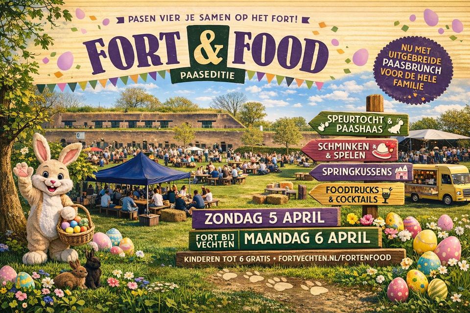 Op zoek naar een gezellig en origineel paasuitje in Utrecht? Tijdens het paasweekend van zondag 5 en maandag 6 april 2026 vindt het Fort & Food Paasfestival plaats op Fort bij Vechten. Een ontspannen paasfestival waar je samen geniet van lekker eten, muziek, activiteiten voor kinderen en de unieke sfeer van het fort.